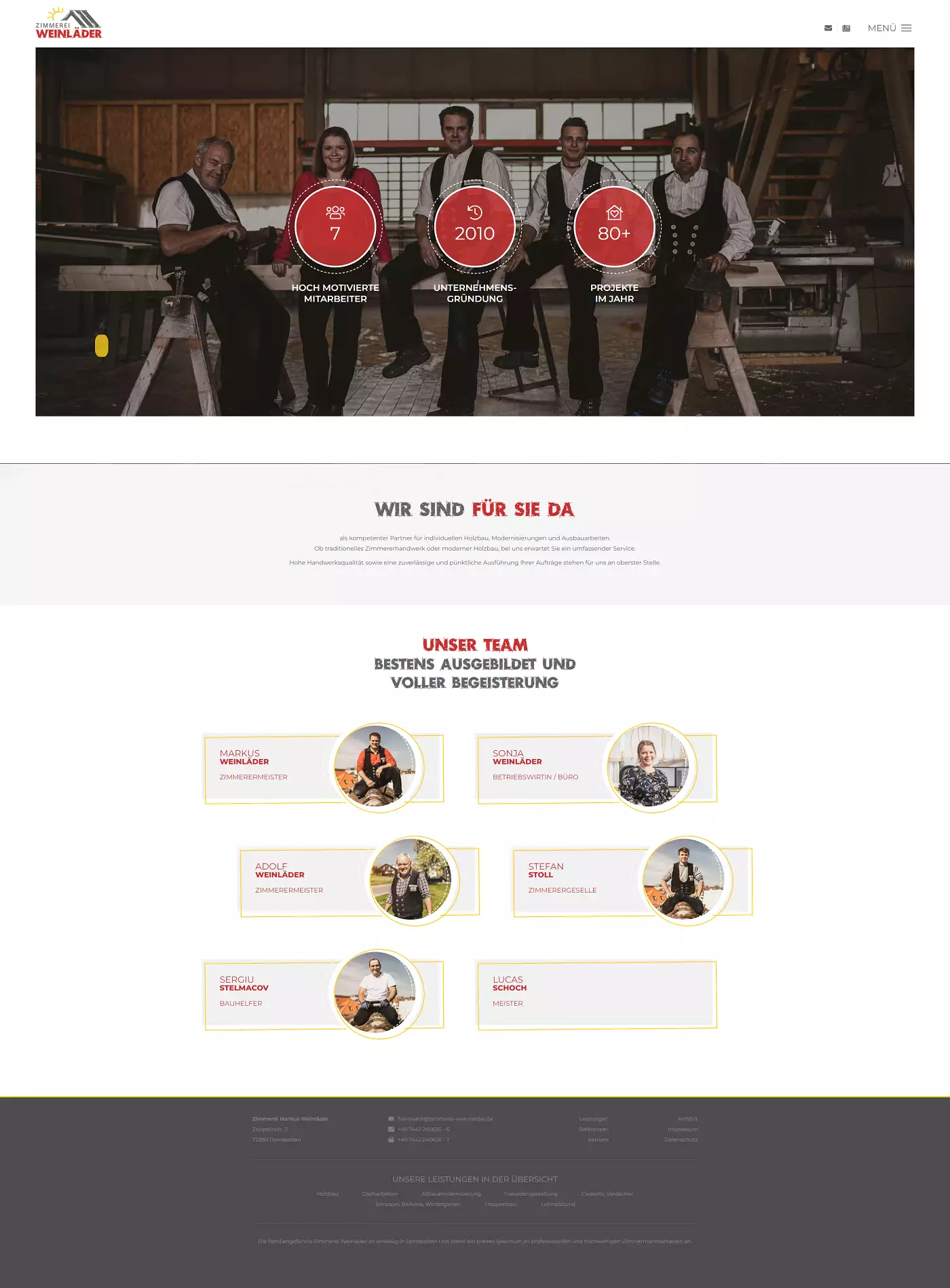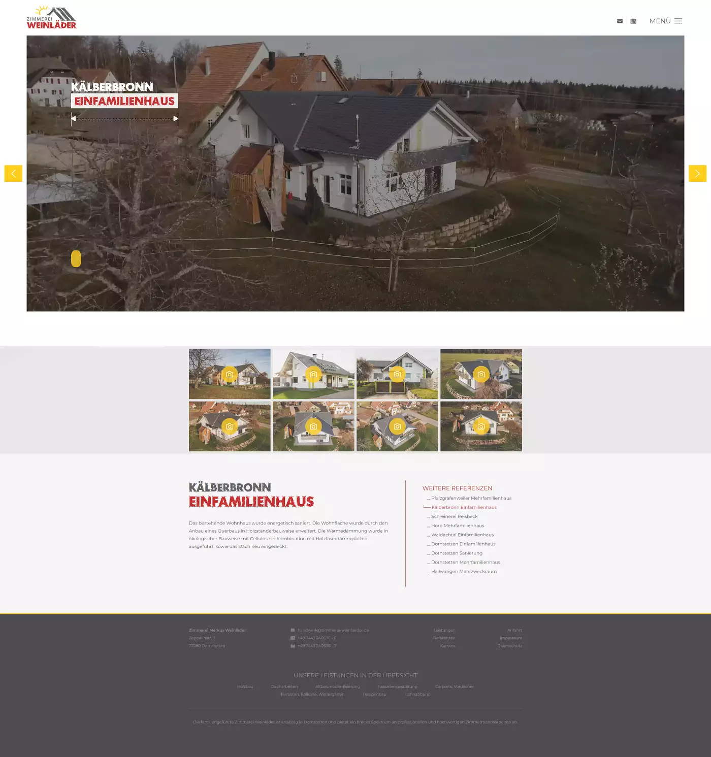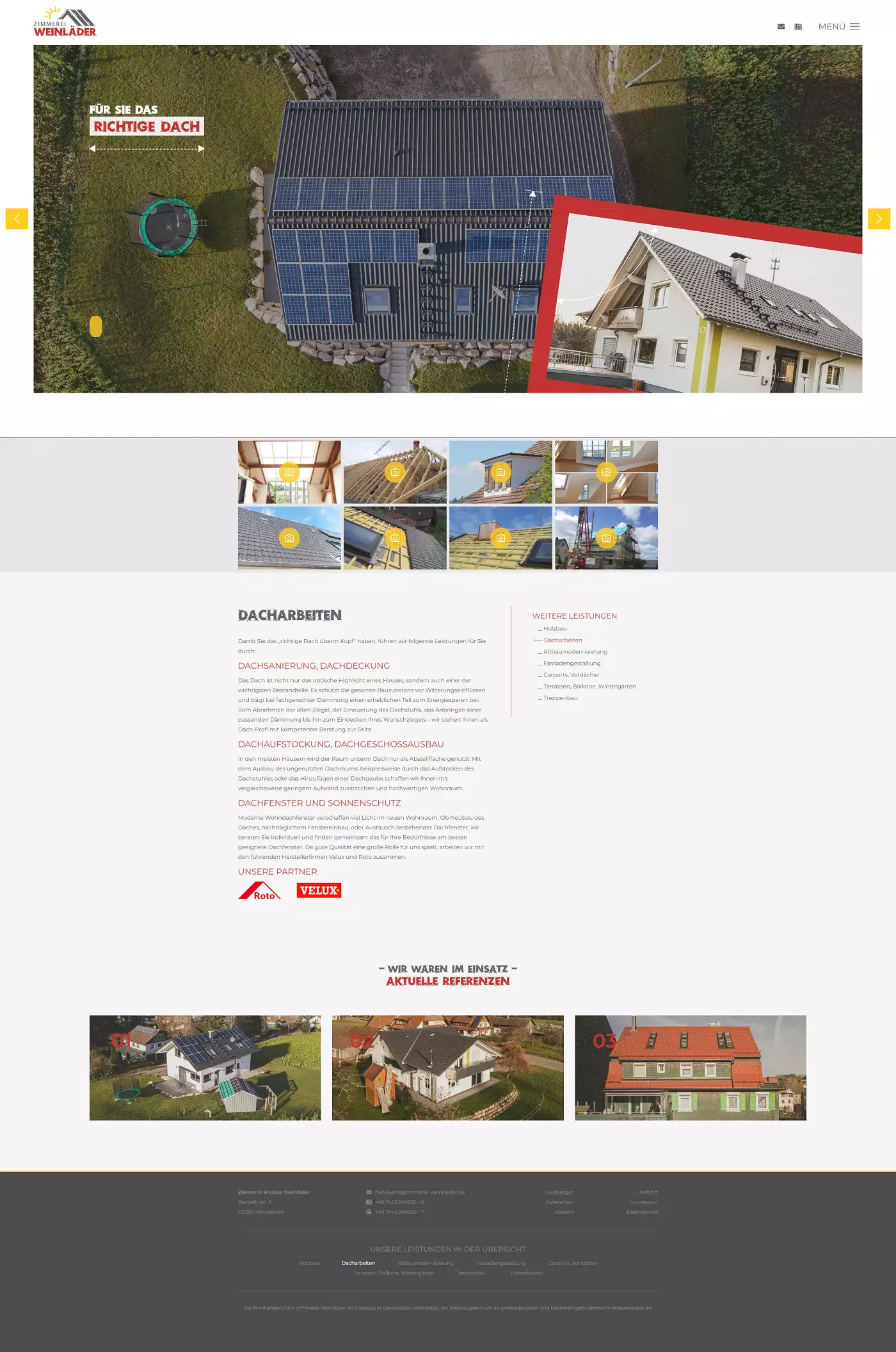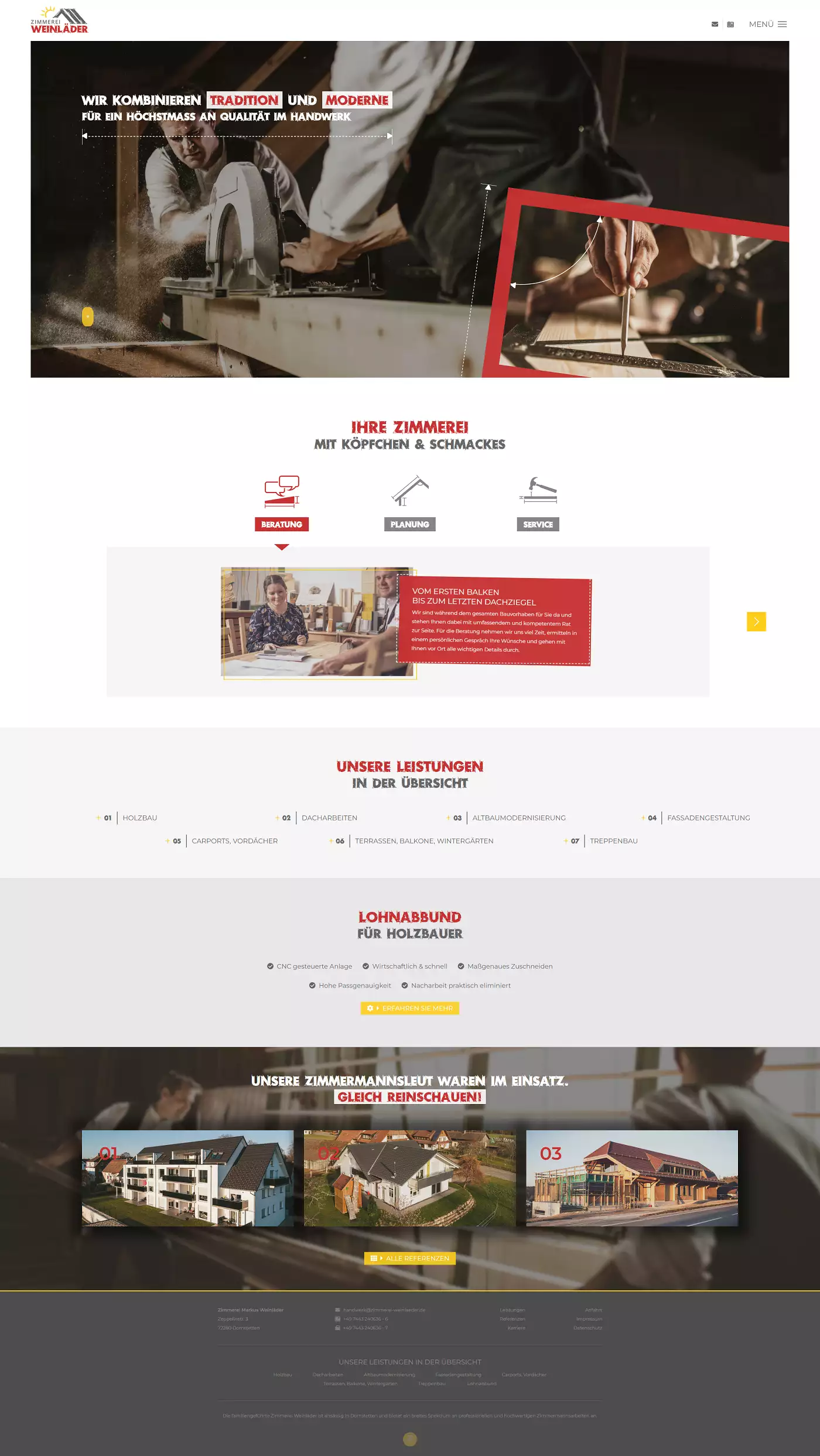 Die Kombination aus Tradition und Moderne, welche die Zimmerer täglich mit Herzblut leben in Kombination mit den Unternehmensschwerpunkten, welche die Grundpfeiler für erfolgreich ausgeführte Projekte sind, bilden die ersten Inhalte der Startseite. Somit stellen wir dirket in den Vordergrund, worauf das Familienunternehmen Wert legt und der Kunde immer im Mittelpunkt steht, sich gut aufgehoben weiß. Im weiteren Verlauf wir ein Überblick in das Leistungsspektrum und die Referenzen ermöglicht.